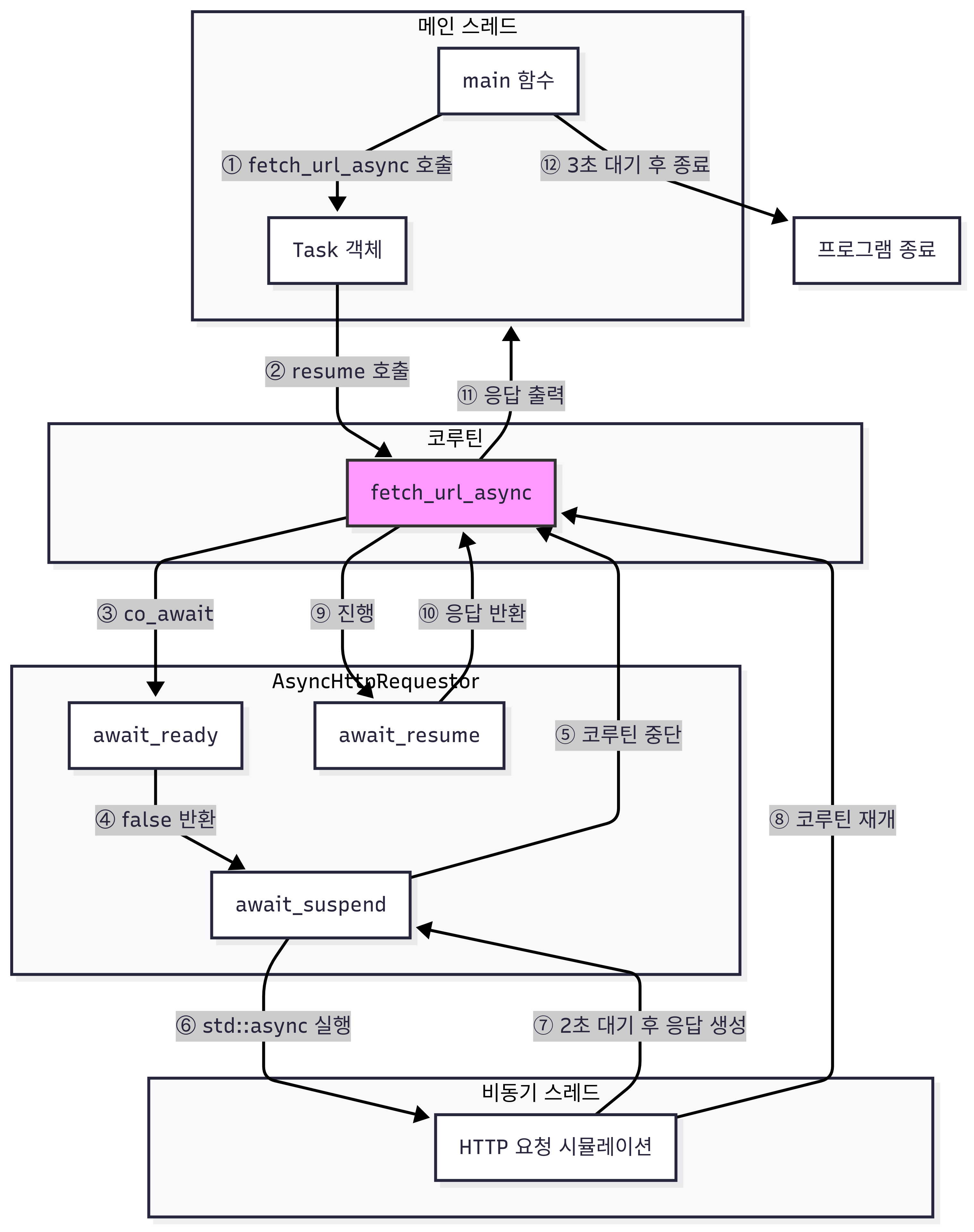 실제 코드가 어떻게 동작하는지 단계별 흐름을 따라가 보면, main 함수에서 코루틴을 호출하고 task.handle.resume()를 통해 실행을 시작한다. 코루틴은 실행 중 co_await를 만나면 일시 중단되고, await_suspend()가 호출된다. 이 함수는 백그라운드 스레드에 I/O 작업을 위임하고, 작업이 완료되면 저장해두었던 코루틴 핸들로 h.resume()를 호출하여 코루틴을 깨운다. 코루틴이 깨어나면 await_resume()가 호출되어 작업 결과를 반환받고, 나머지 코드를 이어서 실행한 후 종료된다. 이러한 과정을 통해 메인 스레드는 I/O 대기 시간 동안 다른 작업을 수행하면서 자원을 효율적으로 활용할 수 있게 된다.