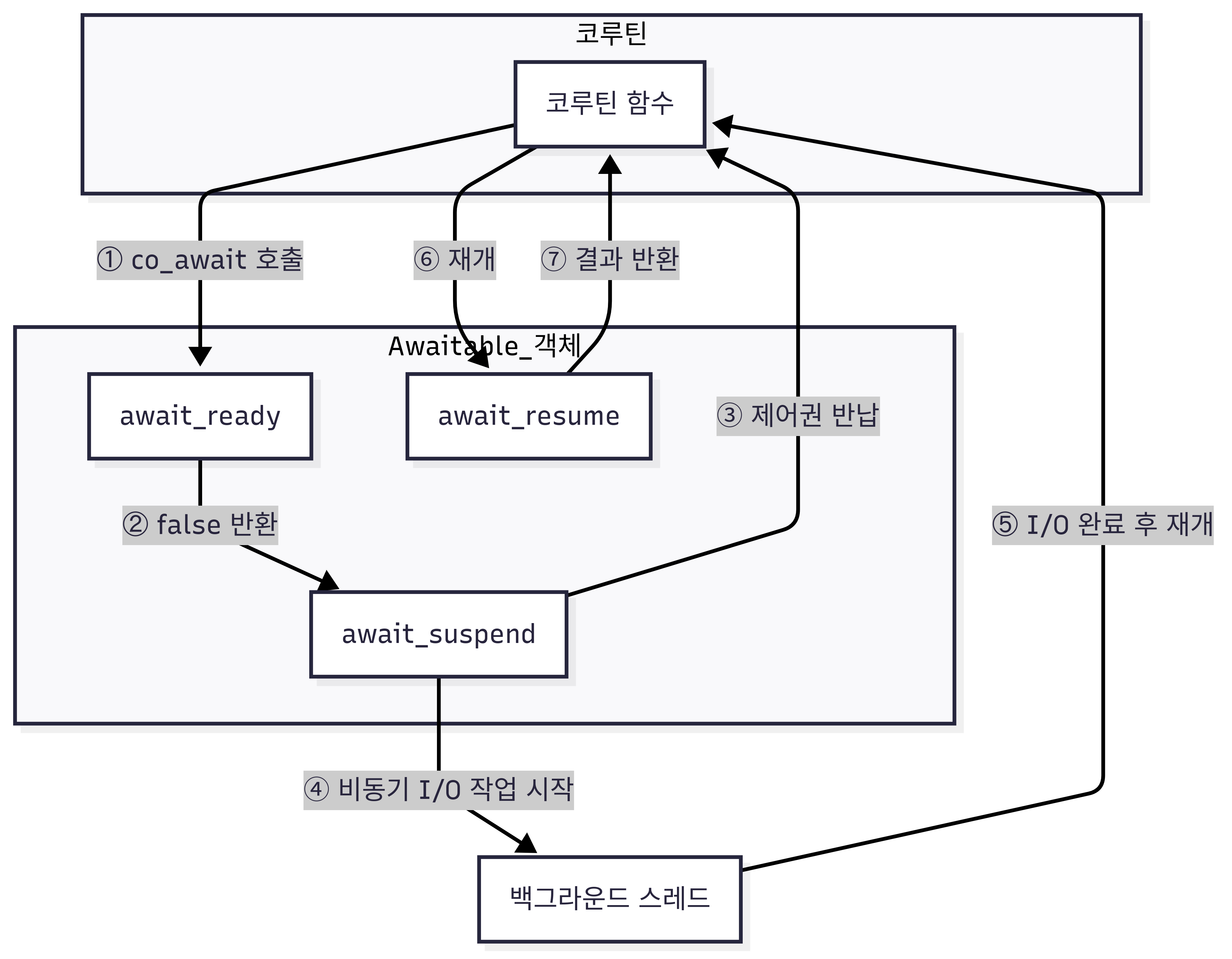코루틴의 작동 원리를 이해하기 위해 몇 가지 핵심 구성 요소를 살펴볼 필요가 있다. 먼저 Task는 코루틴의 생명주기를 책임지는 객체로, 코루틴의 handle을 관리한다. 비동기 작업을 캡슐화하는 핵심은 Awaitable 객체이다. 이 객체는 await_suspend()에서 실제 I/O 작업을 시작하며 코루틴을 중단시키는 역할을 한다. 그리고 작업이 완료된 후 await_resume()에서 그 결과를 반환한다. 코루틴 내부에서는 co_await라는 키워드를 사용하여 Awaitable 객체를 호출하는데, 이 키워드를 만나면 코루틴은 자동으로 제어권을 awaitable에게 넘겨주고 잠시 멈춘다.