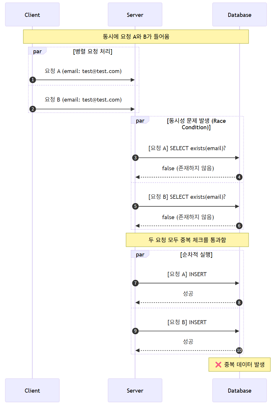 중복 체크 실패 흐름 (레이스 컨디션)