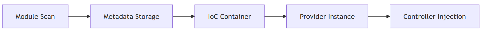 NestJS가 모든 모듈을 순회하며 @Module 메타데이터를 읽는다.