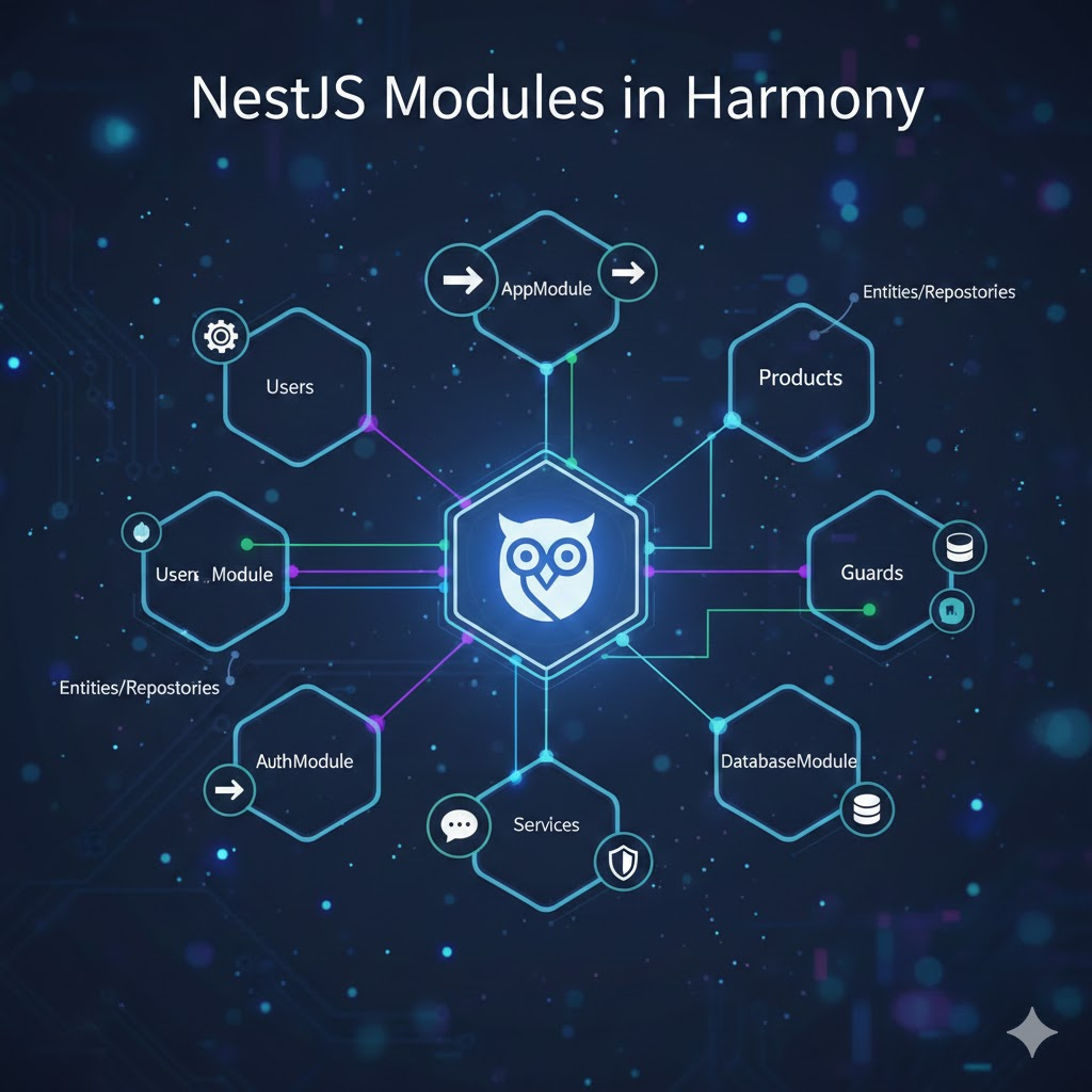 모듈은 관계만 정의한다. 실제 동작은 서비스와 컨트롤러가 담당한다. 이 설계는 다음을 가능하게 한다.